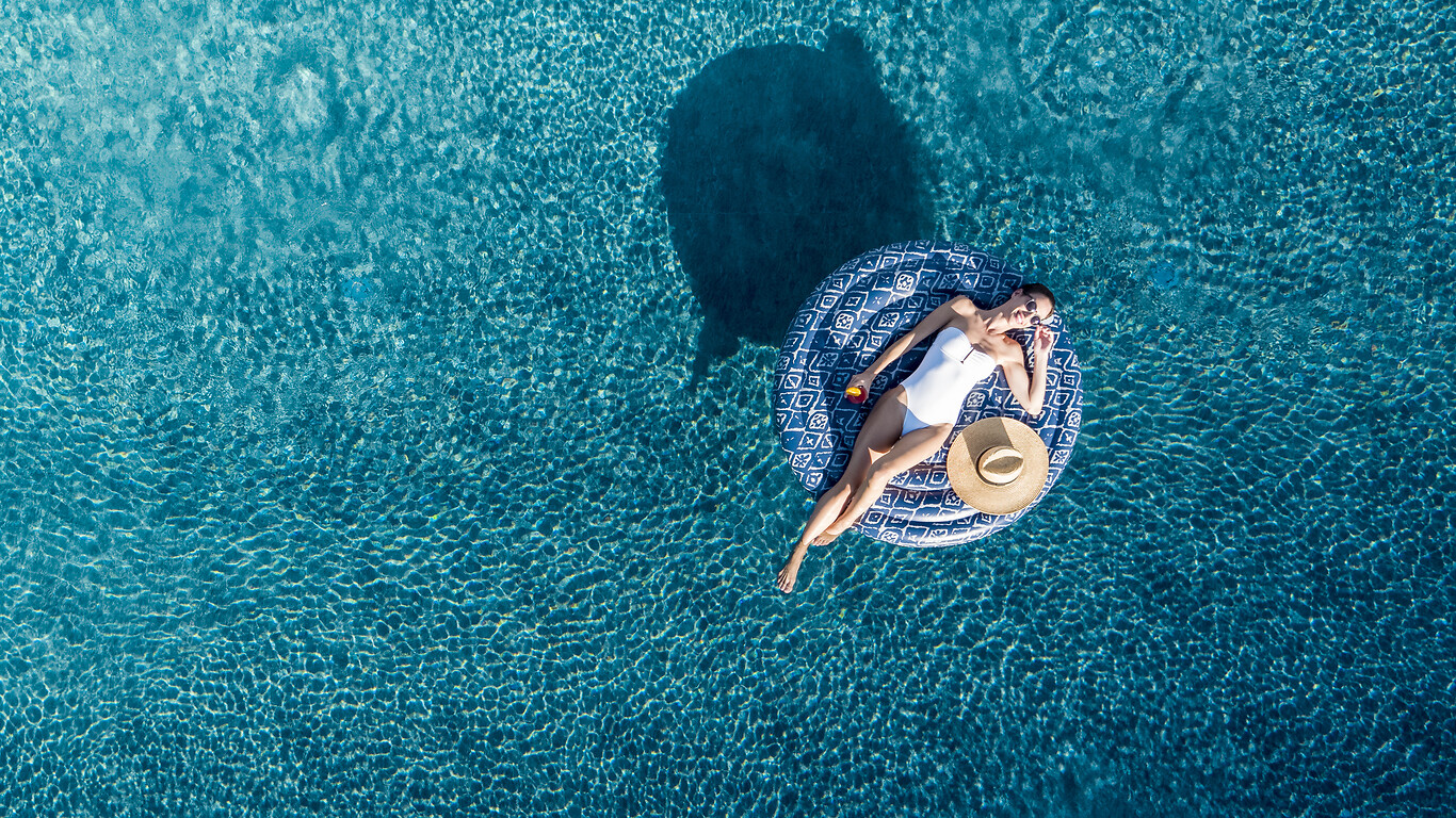 Derrière, on aperçoit les bungalows et les courts de tennis. Là, des choix divins et tout compris s’offrent à vous. Élancez-vous en ski nautique sur l’un des 4 pontons. Lâchez-prise dans un hamac au milieu des pins. Dégustez un cocktail de jus de fruits frais sur-mesure assis à la terrasse panoramique de l’Olea Gourmet Lounge. Attablez-vous sous la pergola du restaurant les Pléiades, entouré de buis et de fleurs sauvages.